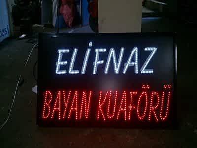 Led Tabela; pleksi veya kompozit zemin üzerine yapılan grafik tasarımlarının etrafına yada içine 0.5 milim çapında yuvarlak delikler açılarak led diotların takılmasıdır. Ledler 3 adette bir direnç bağlanarak yapılır. Dirençlerden ve Eksi (-) uçlardan kaplolar lehimlenerek çıkış sağlanır. Çıkışlar animasyon devresinin artı ve eksi bülümüne takılır. Animasyon devresinin üzerinde bulunan bir diğer eksi ve artı girişlerden ayrı kablo çekilerek 12 volt adaptörde bulunan artı ve eksi başlıklarına takılır. adaptörde bulunan N ve L bölümüne elektrik verilerek tabela çalışmaya başlar. Led tabelalar işçiliği karışık ve zor olsada reklam ürünleri açısından firmaların belirginliğini ön plana çıkaran bir üründür. İçindeki animasyon devresinden dolayı bir çok değişiközellikte yanıp sönerek dikkat çekmeyi sağlar. Led Tabela İmalatı İçin Yetkin Reklam Tabela hizmetinizdedir.